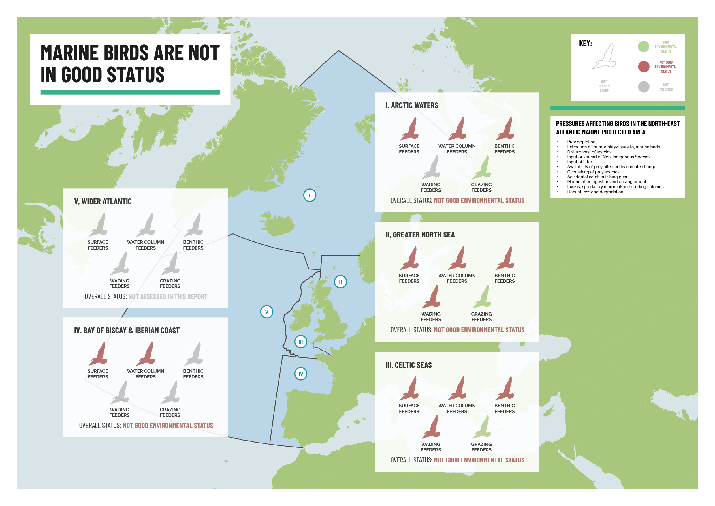 The integrated status of marine bird species was assessed with the help of indicators for: (a) breeding and non-breeding abundance, and (b) breeding productivity for five species groups in four OSPAR Regions. Good environmental status was not achieved for surface-feeding birds (Regions I, II, III, IV), water column-feeding birds (Regions I, II, III, IV), benthic-feeding birds (Regions I, II, III) and wading feeding birds (Regions II, III). Good status was achieved by grazing feeding birds in Regions I, II, and III. The overall status is not good for marine birds in Regions I, II, III, and IV. No assessment could be made of Region V.