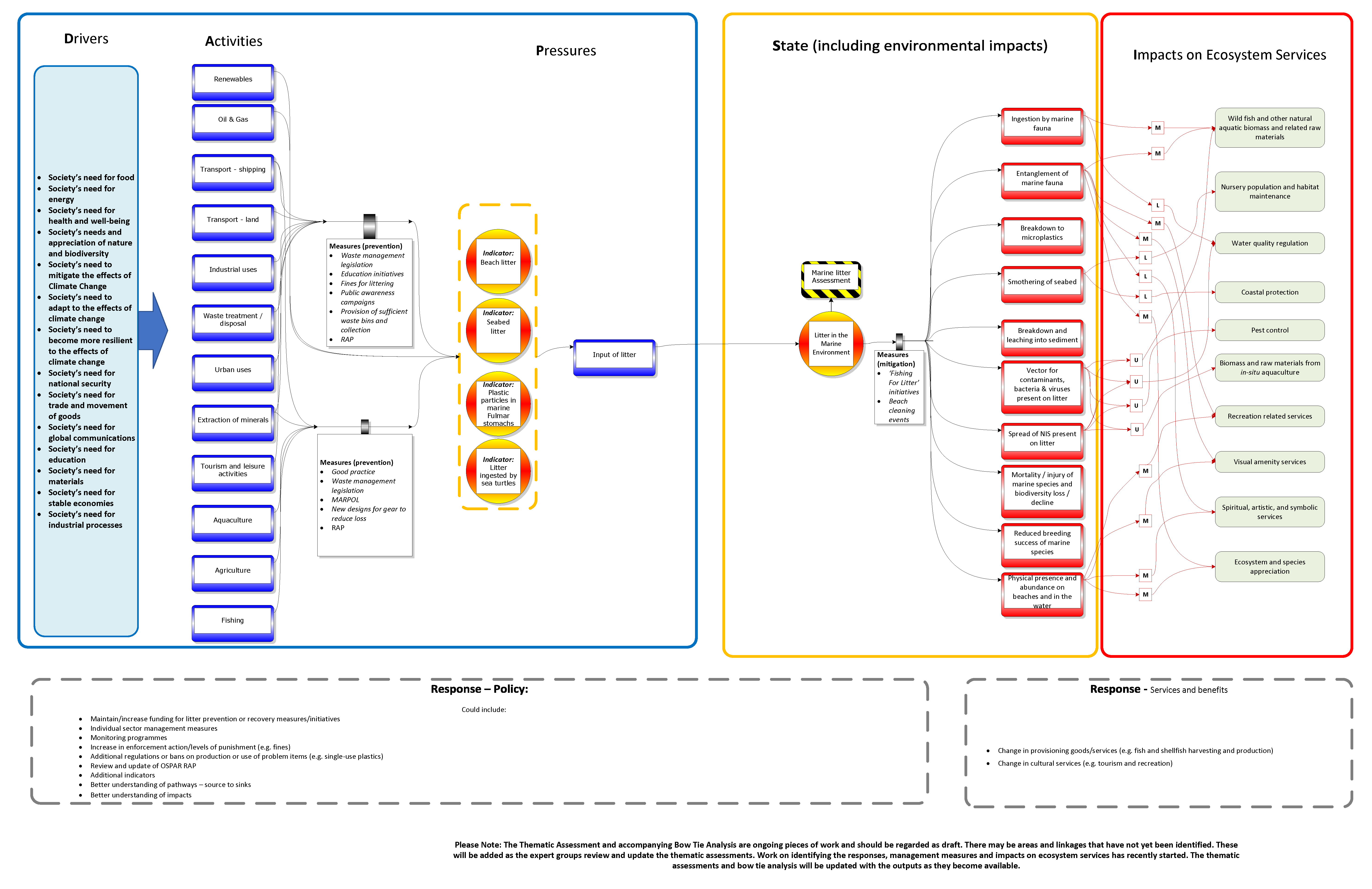 The bow-tie analysis for marine litter shows the relationships between the DAPSIR components which need to be considered in a cumulative effects assessment. Human activities have been identified which contribute to marine litter pressures with the potential to both individually and cumulatively contribute to biodiversity state changes in the thematic assessments for: