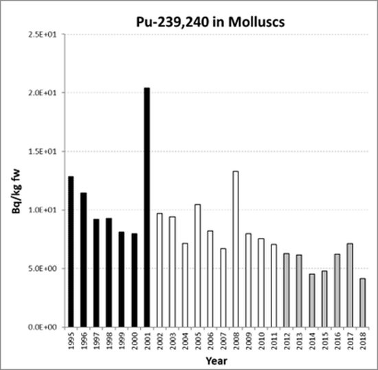 Figure 4: Examples of environmental concentrations for the period 1995 to 2018, showing Cs-137 in seawater in OSPAR RSC sub-region 10, Pu-239,240 in molluscs for OSPAR RSC sub-region 6, Cs-137 in fish for OSPAR RSC sub-region 12 and Tc-99 in seaweed for OSPAR RSC sub-region 6 (evidence of a reduction in all cases). Time periods indicated are baseline period 1995-2001 (black columns), assessment period 2012-2018 (grey columns) and intervening years (white columns). Note, different scales are used for the vertical axes in the examples above.