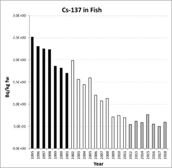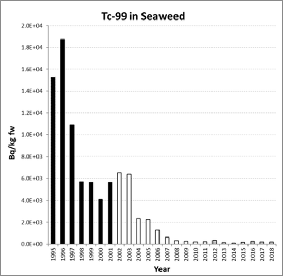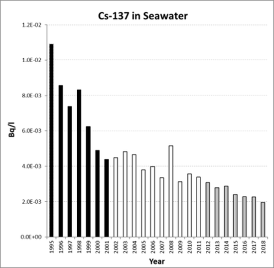 From the assessments that OSPAR has carried out on environmental concentrations of indicator radionuclides for the nuclear sector there is clear evidence that the second objective of the OSPAR RSS under the NEAES 2010-2020 has been fulfilled or more than fulfilled in all of the cases except one. In these situations, therefore, it is clear that environmental concentrations in the assessment period are close to or lower than historic levels. Examples of environmental concentrations for the period 1995 to 2018 are given in Figure 4. In OSPAR RSC sub-region 32 , the statistical assessment showed evidence of an increase in environmental concentrations of H-3 in seawater between the assessment and baseline periods, which probably reflects the influence of the tritium discharges from the French nuclear fuel reprocessing facility at la Hague in OSPAR RSC sub-region 2. OSPAR has recognised in previous periodic evaluations that the industrial scale abatement of tritium in the liquid effluent of nuclear power stations and nuclear reprocessing facilities is currently not technically feasible.