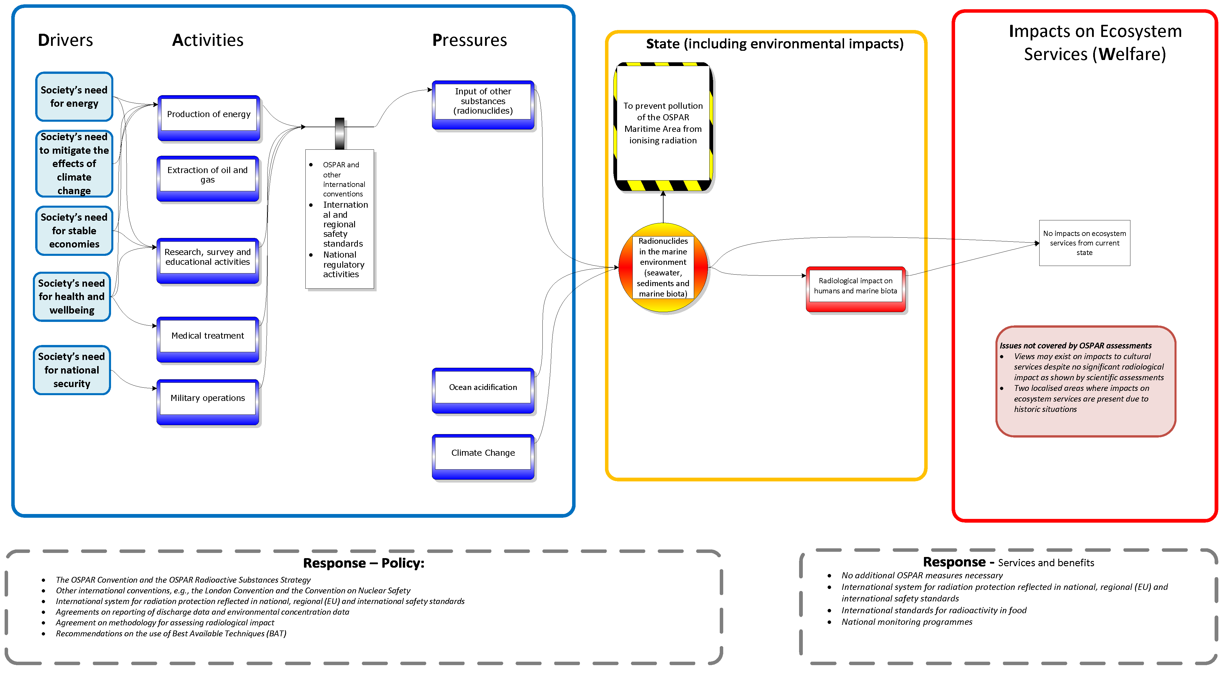 This thematic assessment has identified the inputs of radionuclides from a range of human activities It has concluded that there is no significant radiological impact from the current levels of radionuclides in seawater and marine biota in the OSPAR Maritime Area. The input of radionuclides is included as one of the collective pressures in the biodiversity thematic assessments.