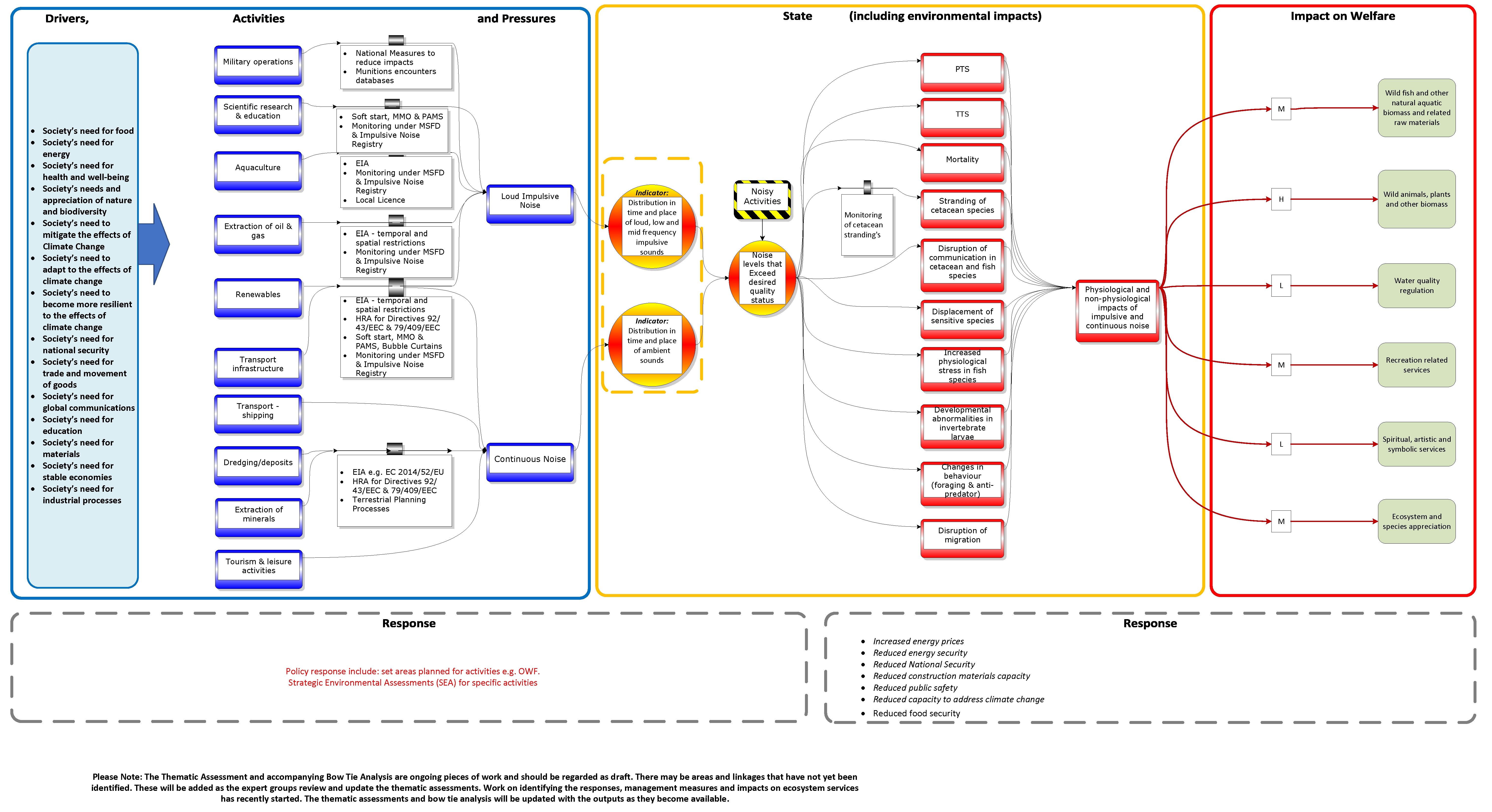 The bow-tie analysis for underwater noise shows the relationships between the DAPSIR components which need to be considered in a cumulative effects assessment. Human activities have been identified which exert either impulsive and / or continuous underwater noise pressures with the potential to both individually and cumulatively contribute to biodiversity state changes in the thematic assessments for: