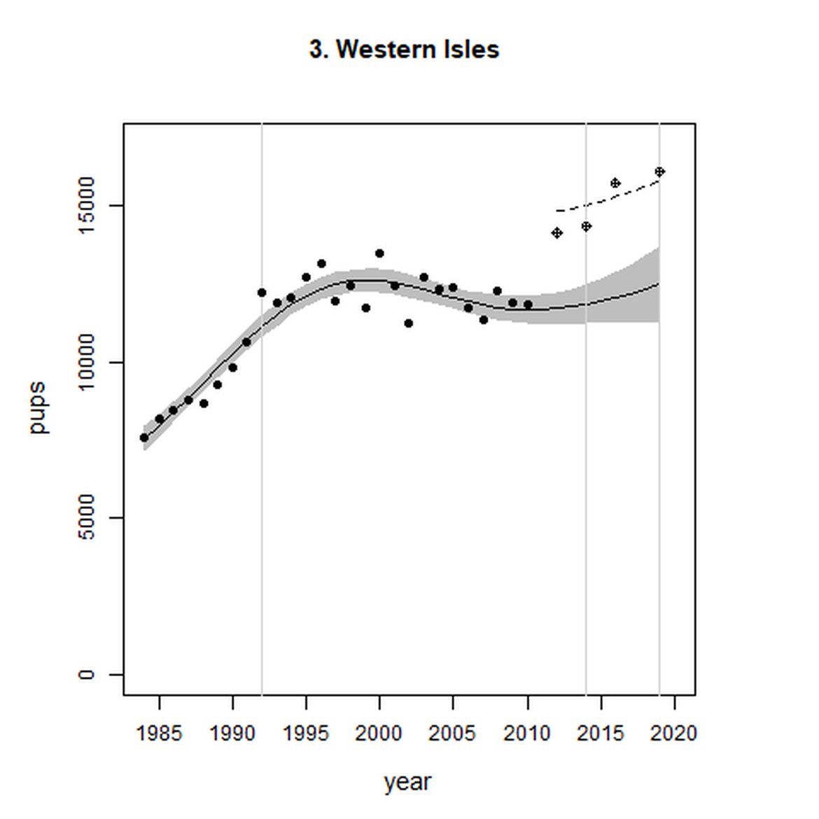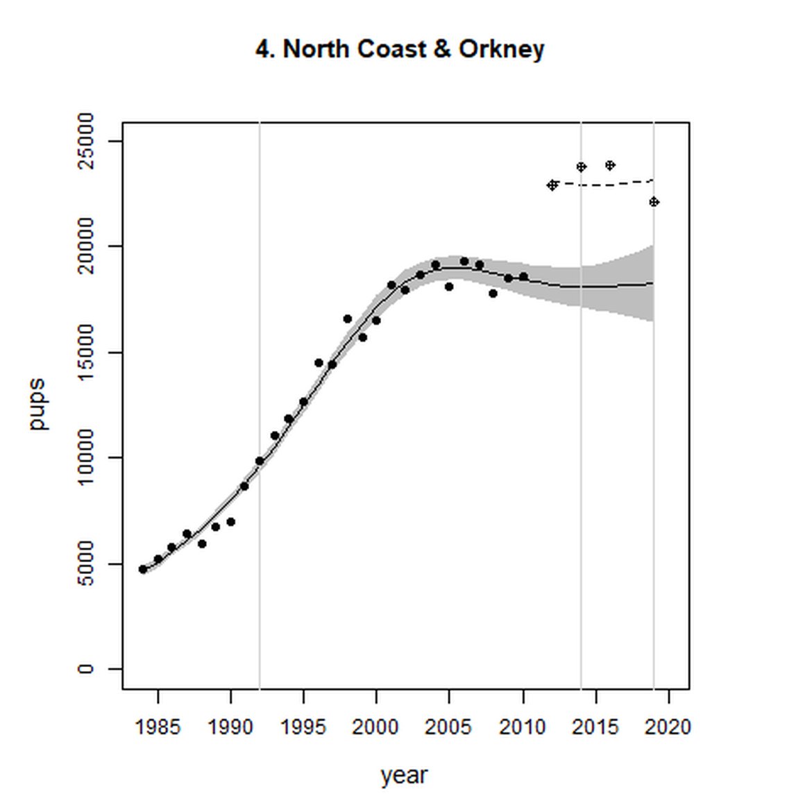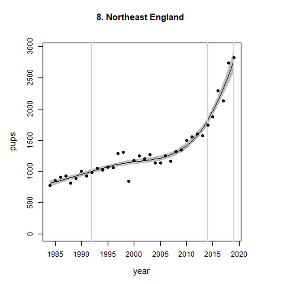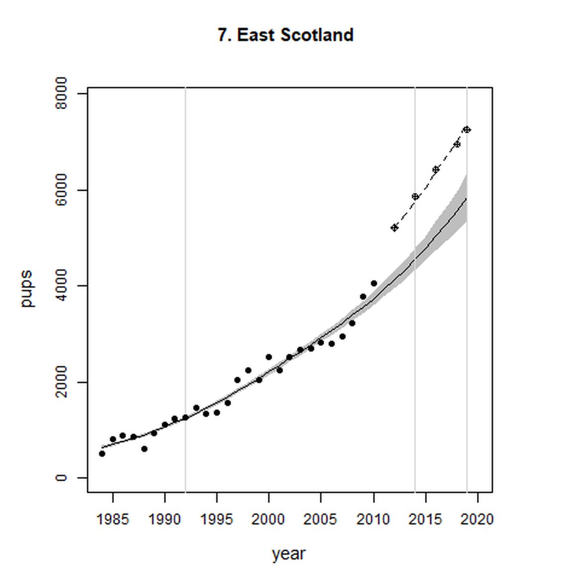 Figure 3: Assessment of long-term change in grey seal pup production (1992*–2019)