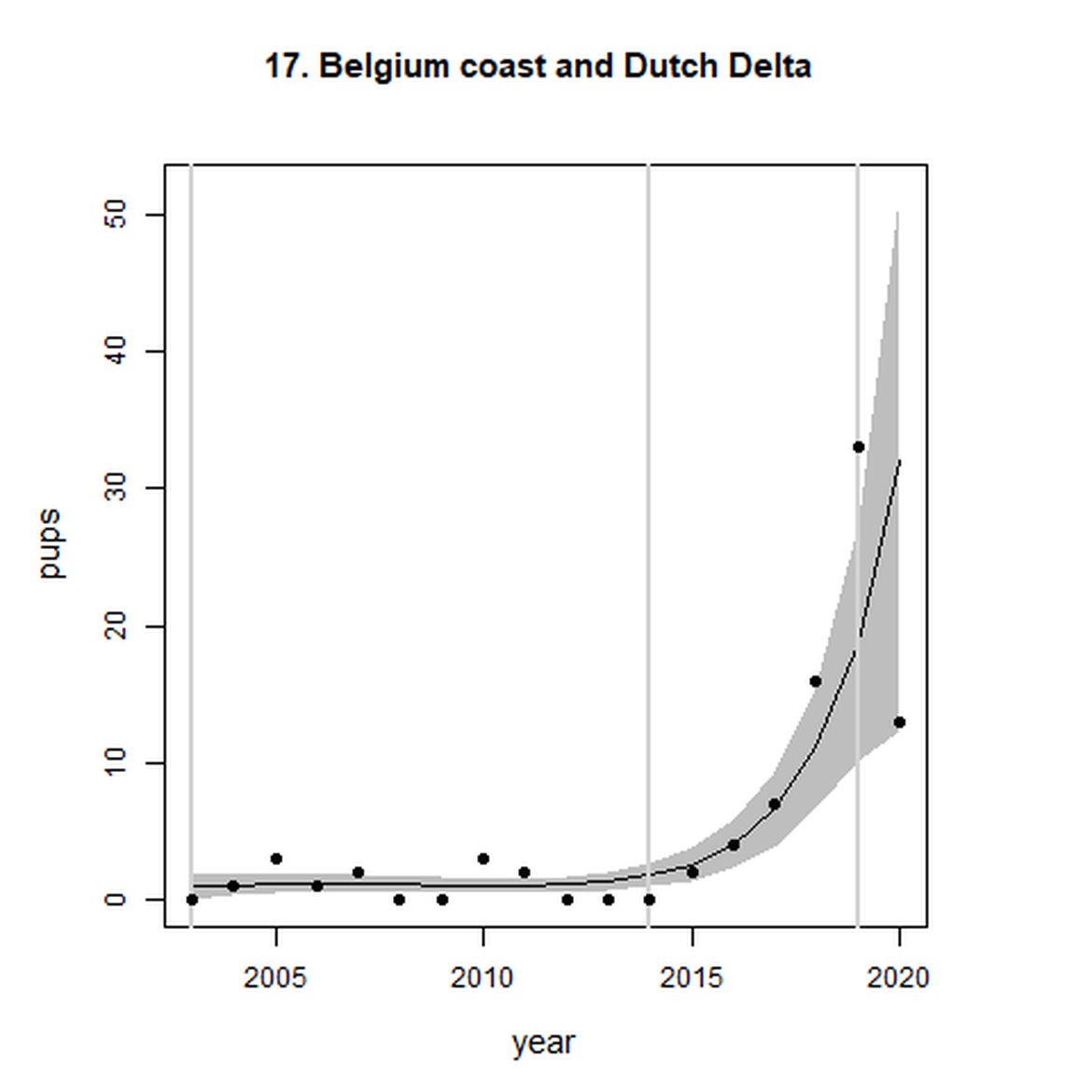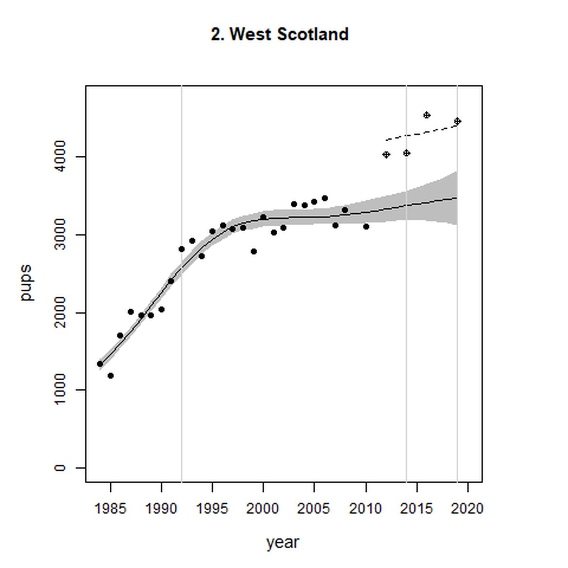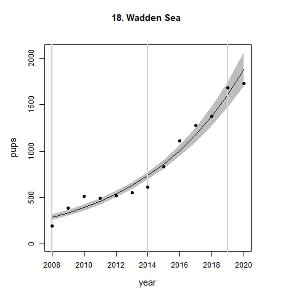From the present data it is not possible to exclude human influence on pup production. Even without pressure from human activities, pup production cannot keep increasing indefinitely and will stabilise as carrying capacity is reached. Further demographic studies could help predict carrying capacity for the number of grey seals in the North-East Atlantic and provide an indication of likely future trends in pup production, with and without impacts from human pressures.