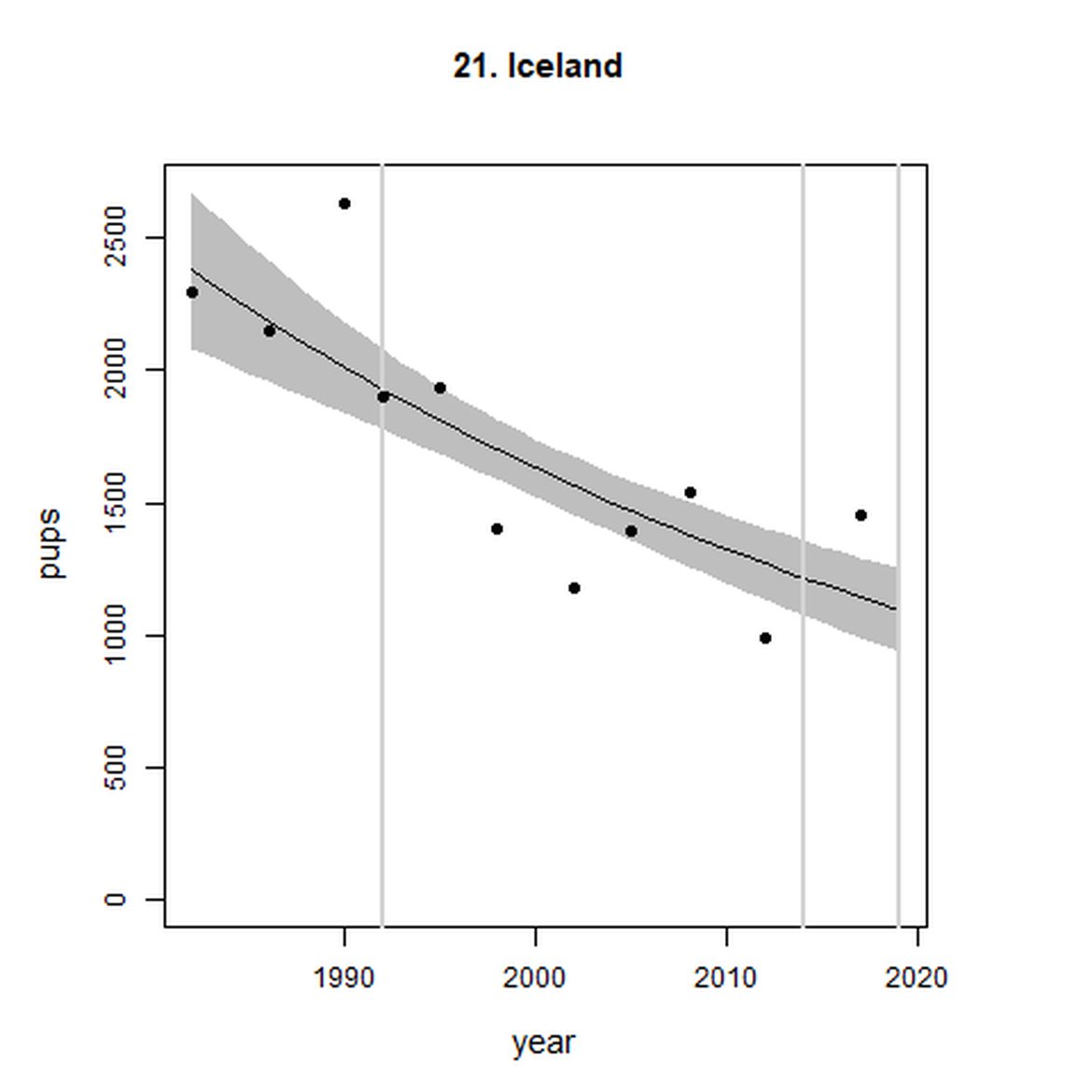 Granquist, S.M. and Hauksson, E., 2019. Aerial census of the Icelandic grey seal (Halichoerus grypus) population in 2017: Pup production, population estimate, trends and current status. Marine and Freshwater Research in Iceland. HV, 2.
