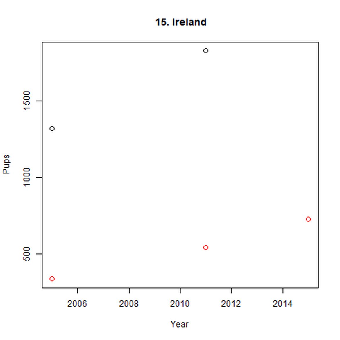 Data points for Ireland were limited and so was not able to be analysed using the methods described above. Grey seal breeding surveys for the Republic of Ireland are focused on seven main breeding areas which encompassed c. 84% of production in 2005 (based on country-wide surveys; Ó Cadhla et al. 2007). Pup production was estimated to be 1 322 and 1 574 for the seven main areas and Republic of Ireland as a whole, respectively. These seven areas were surveyed again between 2009 and 2012 and pup production was estimated to be 1 829 (Ó Cadhla et al., 2013; Figure 4).