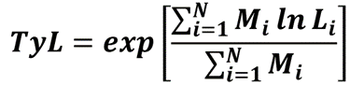 The Typical Length (TyL) is the weighted geometric mean length of fish, with weights given by the standardised catch rate of individuals in an area and defined as follows: