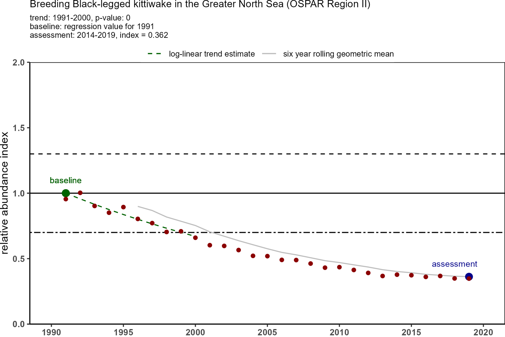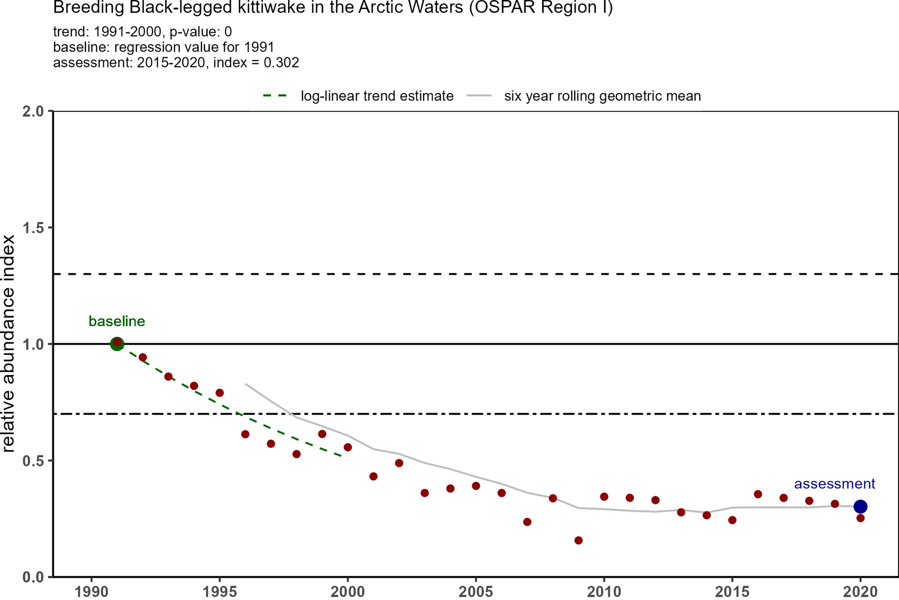 1In case of a significant trend over the first ten years of the time series (regression p value ≤ 0,05), the abundance in the first year (1991) was predicted from the trend regression and used as the baseline value. If no significant trend existed in the first ten years, the mean abundance of the first ten years (ignoring missing years) was used as the baseline value (OSPAR 2023a).