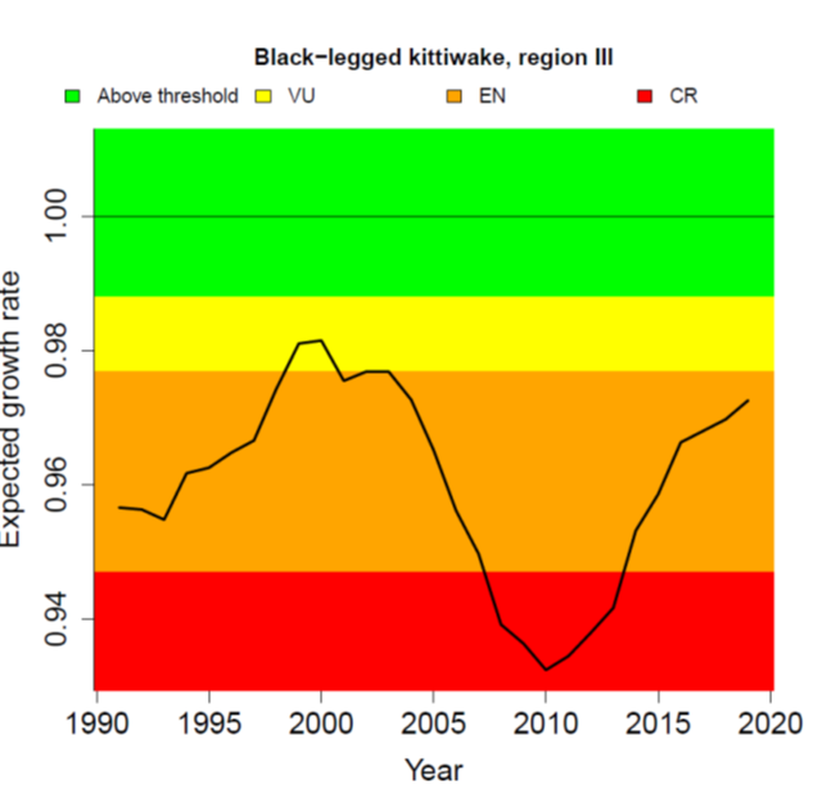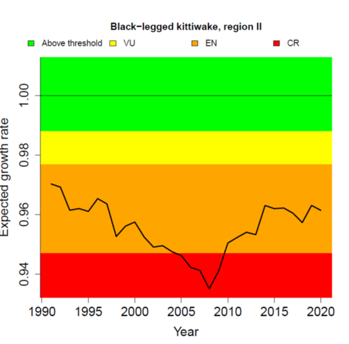 Figure 5: Expected annual population growth rate of Black-legged kittiwake in OSPAR Regions I, II and III, 1991-2020 (black line). The colour-coded background shows the OSPAR QSR2023 threshold values; values in the green zone indicate the threshold is achieved, whereas values in the other zones are below and indicate the threshold is not achieved. For illustration, the figure also shows a breakdown for the corresponding IUCN red list categories of Vulnerable (VU), Endangered (EN) and Critically Endangered (CR). Source: OSPAR (2023b).
