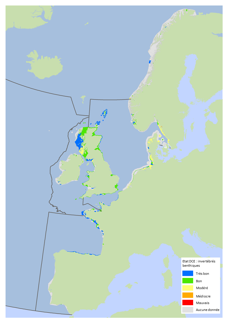 On considère que l’état des invertébrés benthiques est bon ou très bon dans la plupart des zones évaluées (Figure 2). Selon les données fournies, les objectifs de la DCE quant au bon ou très bon état sont atteints pour les invertébrés benthiques dans au moins 95% des masses d’eau évaluées de la France (95%), du Royaume-Uni (96%) et de l’Espagne (100%). En Suède (3%) et au Danemark (5%) seule une petite proportion des masses d’eau évaluées dans la zone maritime OSPAR ont atteint un état bon ou très bon pour les invertébrés benthiques.