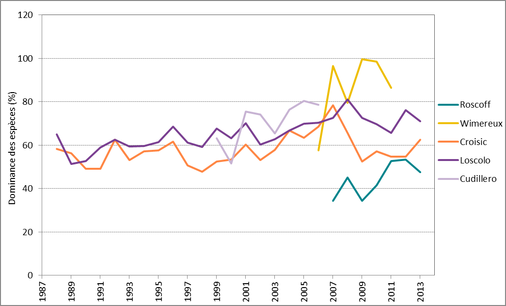 La dominance des espèces varie beaucoup d’une année à l’autre et les variations sont propres à un site (Figure 3). Dans le cas de séries temporelles plus longues (c’est-à-dire, sites du golfe de Gascogne), on relève un point culminant de la dominance en 2007 à 2008 mais il est difficile de déterminer une tendance à long terme. Dans le cas de séries temporelles plus courtes, c’est-à-dire des sites de la mer du Nord au sens large (Roscoff et Wimereux), il semblerait que la tendance de la dominance soit à la hausse à partir de 2006. Il faut cependant être prudent en essayant d’interpréter les tendances pour une période aussi courte.