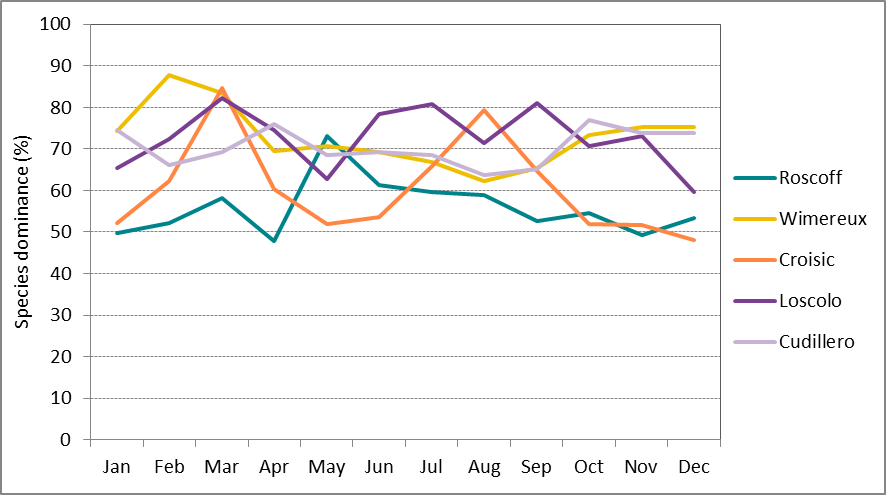 Figure c: Long-term monthly-average species dominance at Roscoff (Astan) (2007-2013), Wimereux (Point C) (2006-2012), Le Croisic (1988 – 2014), Ouest Loscolo (1988-2014) and Cudillero (1999-2006)