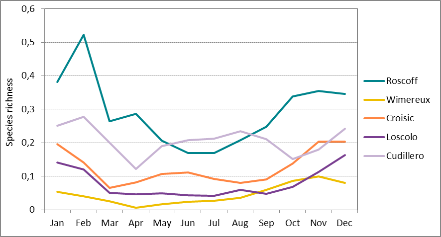 Figure b: Long-term monthly-average species richness at Roscoff (Astan) (2007-2013), Wimereux (Point C) (2006-2012), Le Croisic (1988 – 2014), Ouest Loscolo (1988-2014) and Cudillero (1999-2006)
