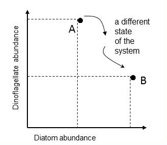 Point A is the ecosystem state at the instant a water sample was taken and is characterised by the abundance values of two lifeforms. Another sample, taken in the same location, yields abundance values that map to a different point in the diatom-dinoflagellate state-space (point B).