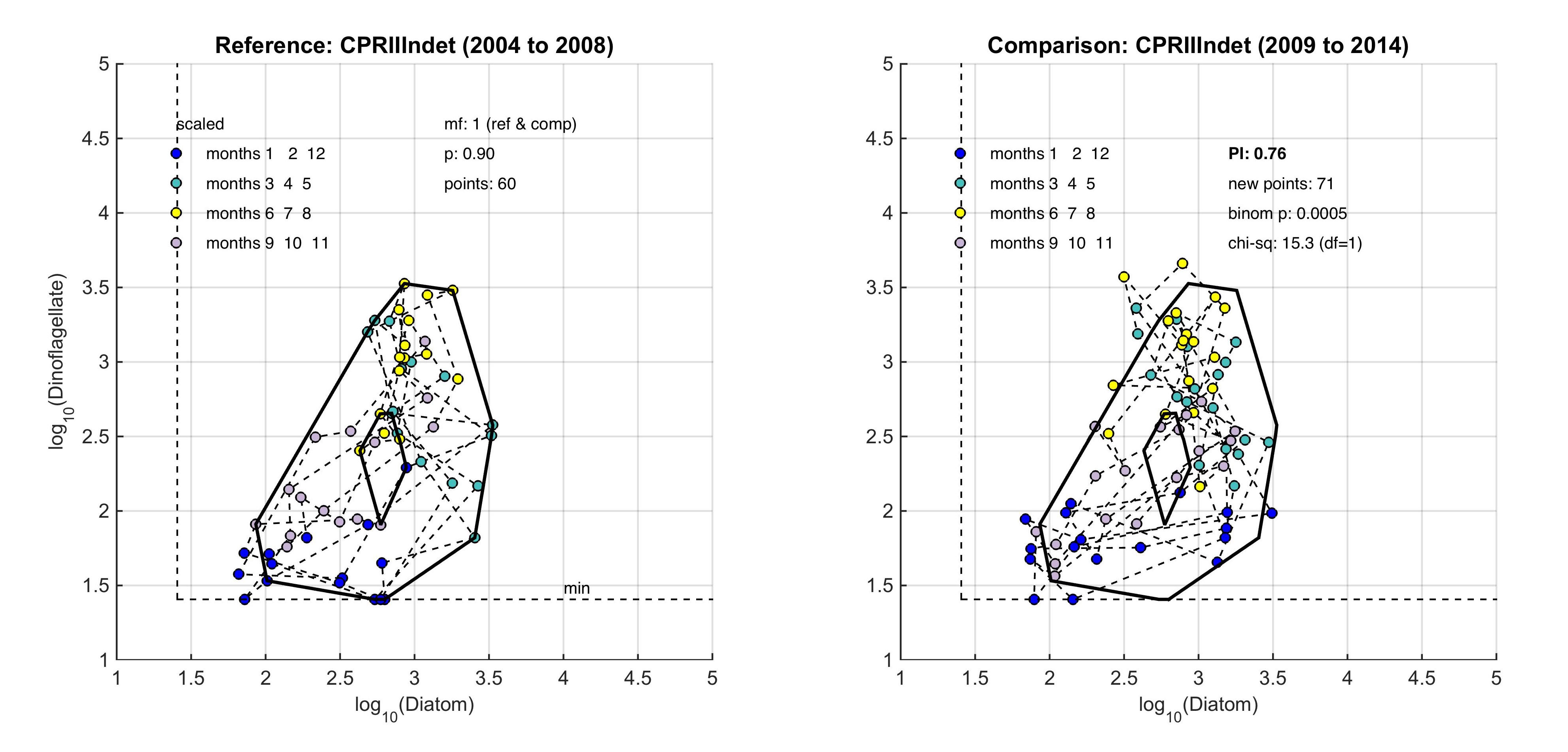The size and shape of the envelope are sensitive to sampling frequency and the total number of samples. Envelopes are made larger by including extreme outer or inner points, and the larger the envelope, the less sensitive it will be to change in the distribution of points in state-space and therefore to detect a change in condition. Conversely, if too many points are excluded the envelope will be small and even minor changes will result in a statistically significant difference. It is therefore desirable to exclude a proportion (p) of points, to eliminate these extremes, and so the 90-percentile was used. Envelopes are therefore drawn around the cloud of points to include a proportion (p=0.9) of the points: with the 5% of points that were most distant from the cloud's centre and the 5% of points that were closest to the centre, excluded. For a Plankton Index to be calculated, it is necessary to establish starting conditions as the basis for making comparisons. In the example shown in Figure b, data collected from the indeterminate area within the Greater North Sea (Figure 2) between 2004 and 2008, were used to create an envelope. The envelope, thus drawn (Figure c left) defines a domain in state-space that contains a set of trajectories of the diatom-dinoflagellate component of the marine pelagic ecosystem and thus represents the prevailing regime during the starting period. The next step is to map a new set of data into the starting condition state-space and compare these new data, at least a dozen points (Figure c right). The value of the PI is the proportion of new points that fall inside the envelope (or to be precise, between the inner and outer envelopes). In the example shown in Figure c, 24% or 17 of the 71 new points lie outside, and the PI is 0.76. A value of 1.0 would indicate no change, and a value of zero would show complete change, with all new points plotting outside the starting condition envelope. The envelope was made by excluding 10% of points, so some new points are expected to fall outside: 7.1 (10% of 71), in the case of the example. The exact probability of getting 17 by chance alone when only 7.1 are expected, can be calculated using a binomial series expansion, or by a chi-square calculation (with 1 df and a 1-tail test). The conclusion is that the value of 0.76, is significantly less than the expected value of 0.9, and so the condition of the phytoplankton in this region, as determined by diatoms and dinoflagellates, was statistically significantly (p<0.01) different between the two periods. |