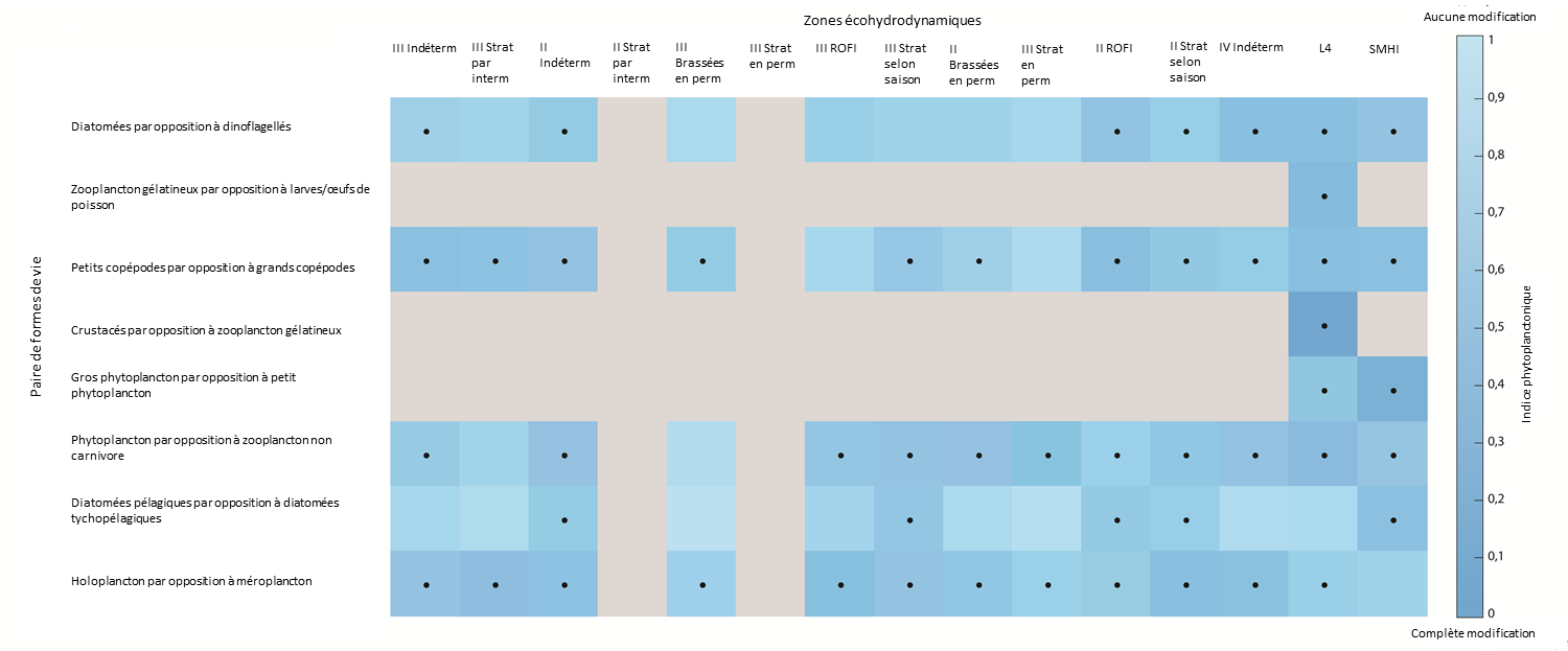 Le bleu foncé indique une modification plus prononcée. Le gris indique que les données permettant de déterminer l’indice planctonique sont insuffisantes/pas bien représentées. Les cases à pois indiquent des modifications significatives (p<0,01) depuis la période de 2004 à 2008. Les modifications de l’indice planctonique n’indiquent pas nécessairement une détérioration des conditions écologiques. Elles indiquent cependant une modification par rapport aux conditions d’origine. L’abscisse représente les zones écohydrodynamiques décrites dans la figure 2.