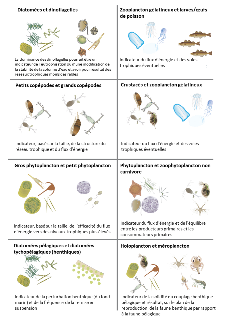 Le plancton (algues et animaux microscopiques) constitue la base des réseaux trophiques marins, il s’agit donc d’un indicateur important de l’état des écosystèmes. Les modifications des communautés planctoniques peuvent affecter des niveaux plus élevés des réseaux trophiques, tels que les mollusques et crustacés, le poisson et les oiseaux de mer, puisque ces organismes dépendent directement ou indirectement du plancton. On peut utiliser des indicateurs se fondant sur des formes de vie du plancton (c’est-à-dire des organismes possédant les mêmes traits fonctionnels; Figure 1) pour révéler les réactions des communautés planctoniques à des facteurs tels que la charge de nutriments d’origine anthropique et les modifications entraînées par le climat. Etudiées ensemble en paires ayant des rapports écologiques pertinents (voir les exemples de la Figure 1), les modifications de l’abondance relative de deux formes de vie (à savoir paire de formes de vie) peuvent indiquer des modifications des aspects fondamentaux de la fonction des écosystèmes, il s’agit notamment des liens entre les communautés pélagiques et benthiques, des flux et voies d’énergie et des interactions avec les réseaux trophiques.