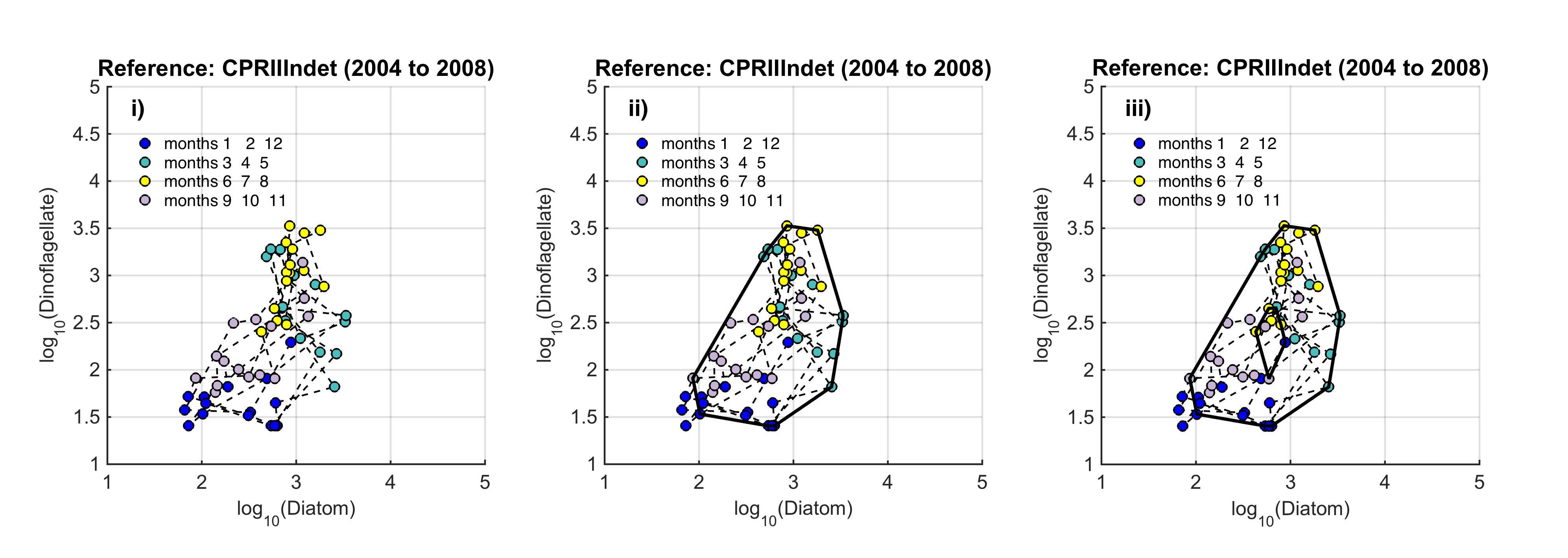 The path between the two states is called a trajectory, and the condition of the phytoplankton is defined by the trajectory drawn in the state-space by a set of points. Such trajectories reflect: (i) cyclic and medium-term variability (the higher order consistencies in the plankton that result from seasonal cycles, species succession and interannual variability); and (ii) long-term variability that might result from environmental pressure. The seasonal nature of plankton production and the succession of species in seasonally stratifying seas, result in this trajectory tending in a certain direction (as plankton growth increases in the spring and declines during autumn), such that the trajectory tends towards its starting point. Given roughly constant external pressures, the data collected from a particular location over a period of years form a cloud of points in state-space that can be referred to as a regime. Long-term variability may show a persistent trend of movement away from a starting point in state-space. To define a regime, an envelope can be drawn about this group of points using a convex hull method. Because of theoretical arguments that the envelope should be doughnut-shaped with a central hole, bounding curves can be fitted outside and inside the cloud of points (Figure b). |