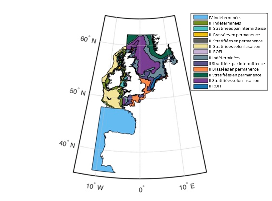 Because plankton community composition, distribution, and dynamics are closely linked to their environment, the analysis was performed at the scale of the ‘ecohydrodynamic’ zones (EHD) (van Leeuwen et al., 2015). EHDs were determined through analysis of a 50-year hindcast using the General Estuarine Transport Model (GETM) physical model of North Sea hydrodynamics (the model is at lower resolution in the Celtic Seas and is not developed for the Bay of Biscay and Iberian Coast). EHDs are constructed using density stratification, the most important large-scale physical feature in shallow shelf seas (van Leeuwen et al., 2015). Density stratification occurs when the buoyancy of surface waters (influenced by freshwater input or solar heating) is stronger than turbulence and vertical mixing, which limits vertical exchange across the pycnocline (van Leeuwen et al., 2015). The predominant EHD zone types, based on water column structure, are: permanently mixed throughout the year; permanently stratified throughout the year; regions of freshwater influence (ROFIs); seasonally stratified (for about half the year, including summer); intermittently stratified; and indeterminate regions (inconsistently alternate between the above). At the time of calculating this assessment (2016), the EHD model was more reliable and detailed for the Greater North Sea than for the Celtic Seas. The model had not been developed for the Bay of Biscay and Iberian Coast so that sub-region was considered as a single region of indeterminate status.