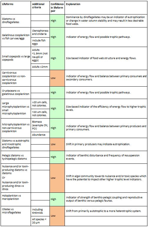 Each lifeform pair comprises two ecologically-relevant lifeforms, which contain common functional traits (Table a). The rationale for selecting the lifeform pairs and additional criteria containing supplementary information on lifeforms is listed in Table a. The database master species list was built by assigning functional traits to each species for a dataset and then adding additional new datasets to expand the master species list (Figure e). The species list for each new dataset was assigned a unique Aphia ID via the World Register of Marine Species (WoRMS). The new dataset’s species list was then compared with the plankton database’s master species list via Aphia IDs and any new species were identified. This process ensures that each species is only entered in the database once. The new species were then manually assigned functional traits by searching the literature; fields were left blank where functional traits for species were unknown. Once traits were assigned, the new species were added to the master species list. Queries were constructed to build lifeforms from the functional trait information (Table b). A simple method of confidence assessment was used to determine the confidence in each lifeform (Table c). Using expert opinion, each lifeform was evaluated on two characteristics: the ability to identify and speciate organisms in that lifeform using light microscopy and the understanding of the accuracy of determining traits assigned to the lifeform. For example, low confidence is assigned to the lifeform pair ‘diatoms vs autotrophic and mixotrophic dinoflagellates’ because the mixotrophic and autotrophic mode of nutrition of many dinoflagellates species is currently uncertain. Thus the accuracy of assigning the lifeform category is low. Likewise, the lifeform pair ‘carnivorous zooplankton vs non-carnivorous zooplankton’ has a low confidence designation since the feeding habits of many abundant and common zooplankton species remain unknown. Further investigation must also be conducted to decide whether both nuisance and toxin-producing lifeform pairs are required. Only pairs with two high-confidence lifeforms were used in the OSPAR reporting.
