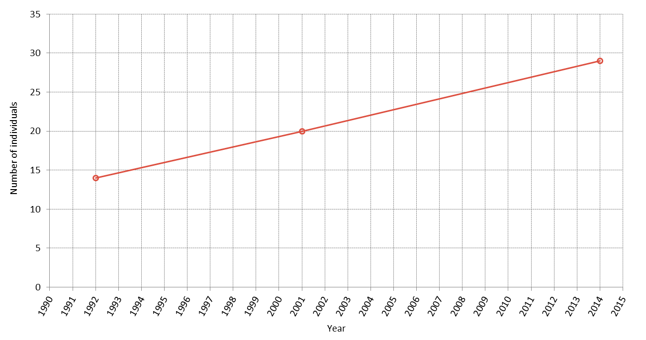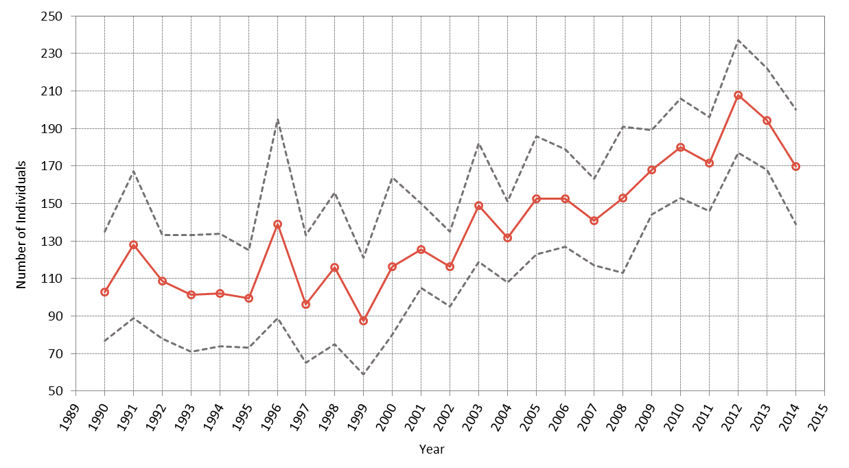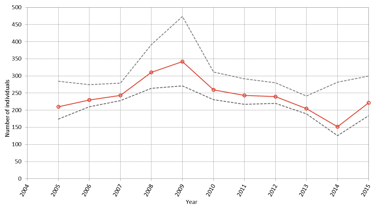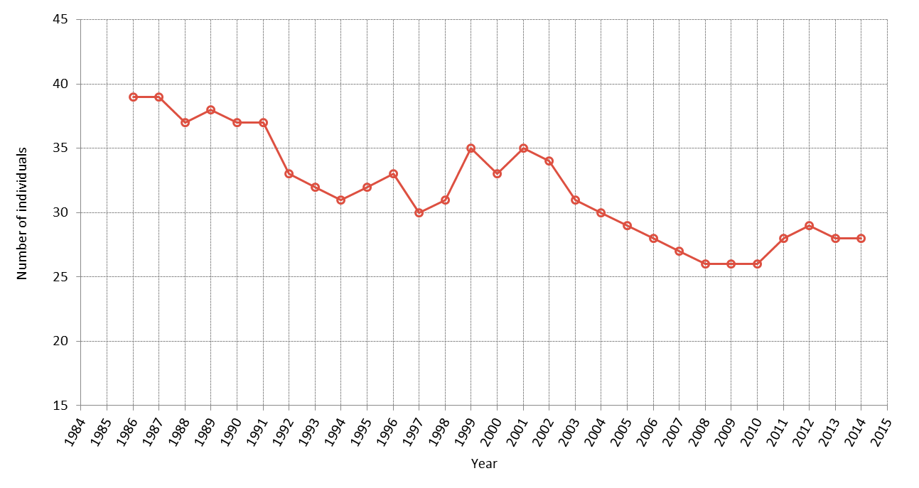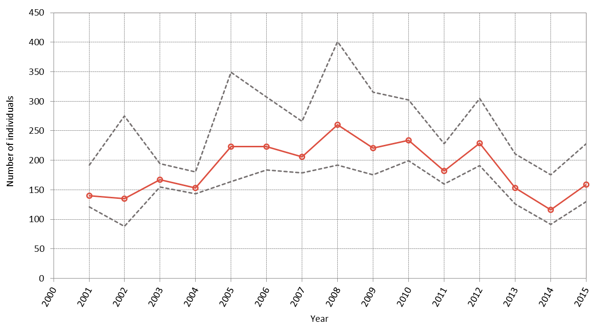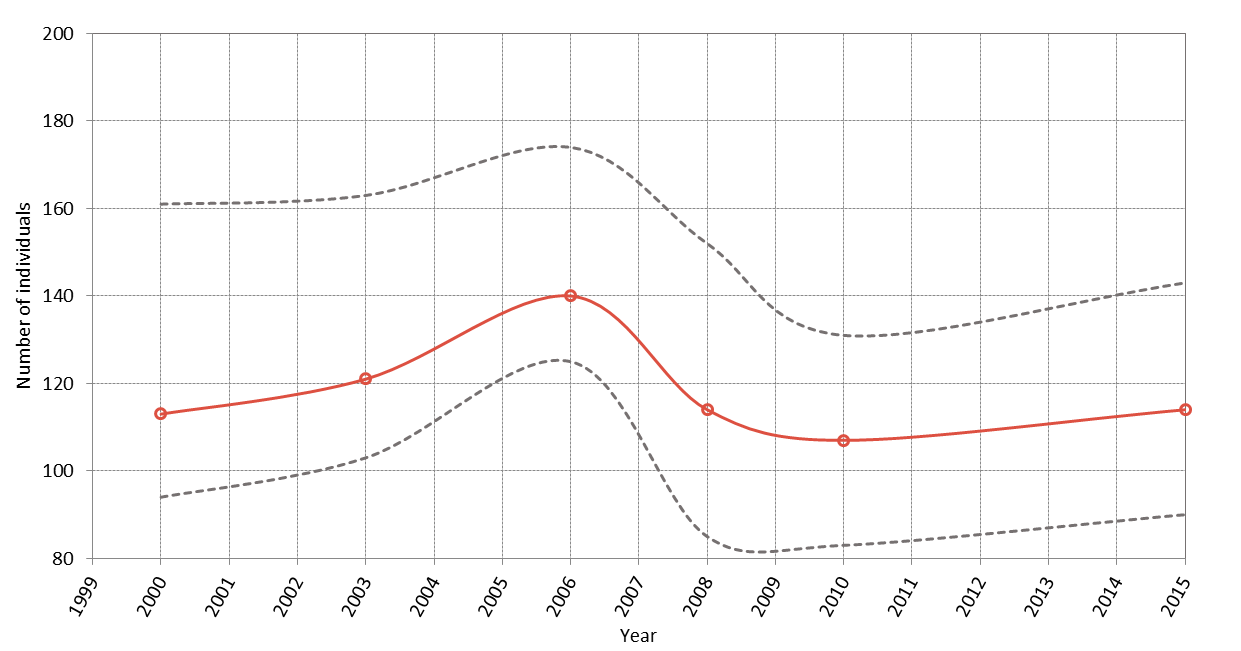 Analysis of mark-recapture studies using a Bayesian approach estimates the population on the east coast of Scotland at 87–208 animals, with the latest estimate (2014) being 170 (95% Highest Posterior Density interval: 139–200). Despite interannual variability, the population is considered to be stable and may be showing signs of increase (Figure b: Cheney et al., 2014).