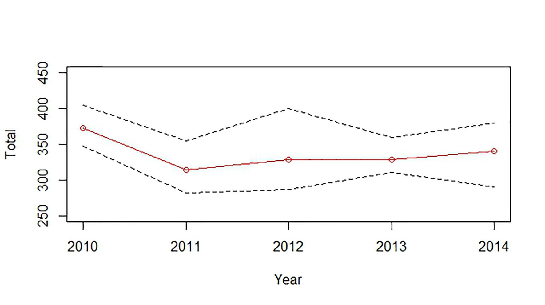 Dashed lines show the 95% upper and lower confidence interval.