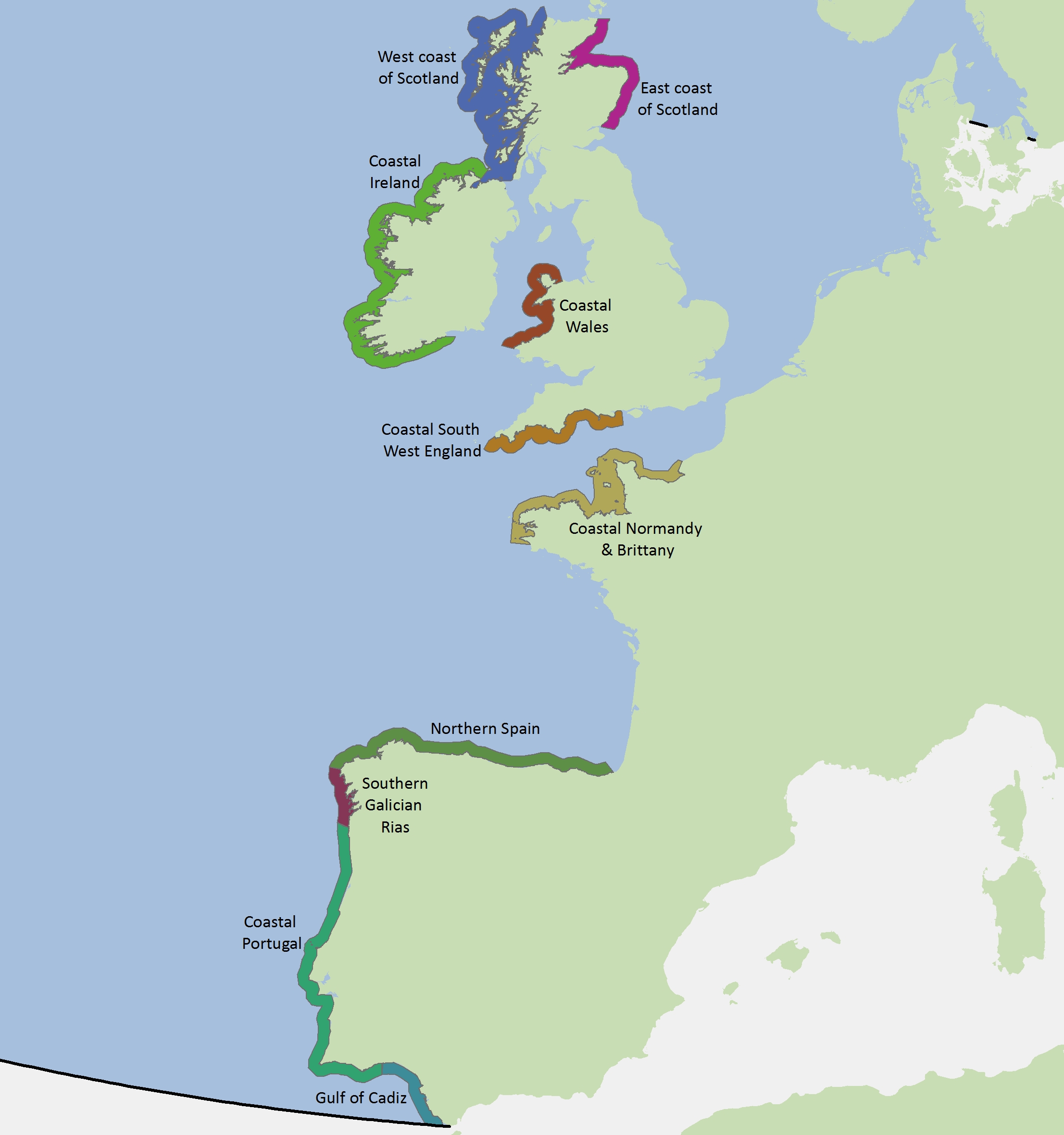 Bottlenose dolphins occur in coastal waters of Spain, Portugal, north-west France, west and south Ireland (including a genetically distinct population in the Shannon Estuary and a more wide-ranging coastal population that moves along the west coast), north-east Scotland (particularly the Moray Firth south to the Firth of Forth), west Scotland, north and west Wales (including all of Cardigan Bay), and parts of the English Channel. In past centuries, the species appears to have regularly occupied the southern North Sea and a number of estuaries within the study area. However populations in these locations are no longer common.