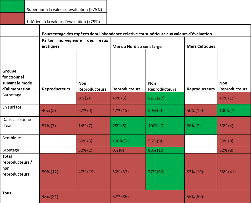 Le pourcentage de toutes les espèces dans chaque groupe fonctionnel dépassant les valeurs d’évaluation pour l’abondance relative des reproducteurs et pour l’abondance relative des non-reproducteurs en 2014 dans la mer du Nord au sens large et en 2015 dans d’autres Régions OSPAR est indiqué dans le Tableau 1.