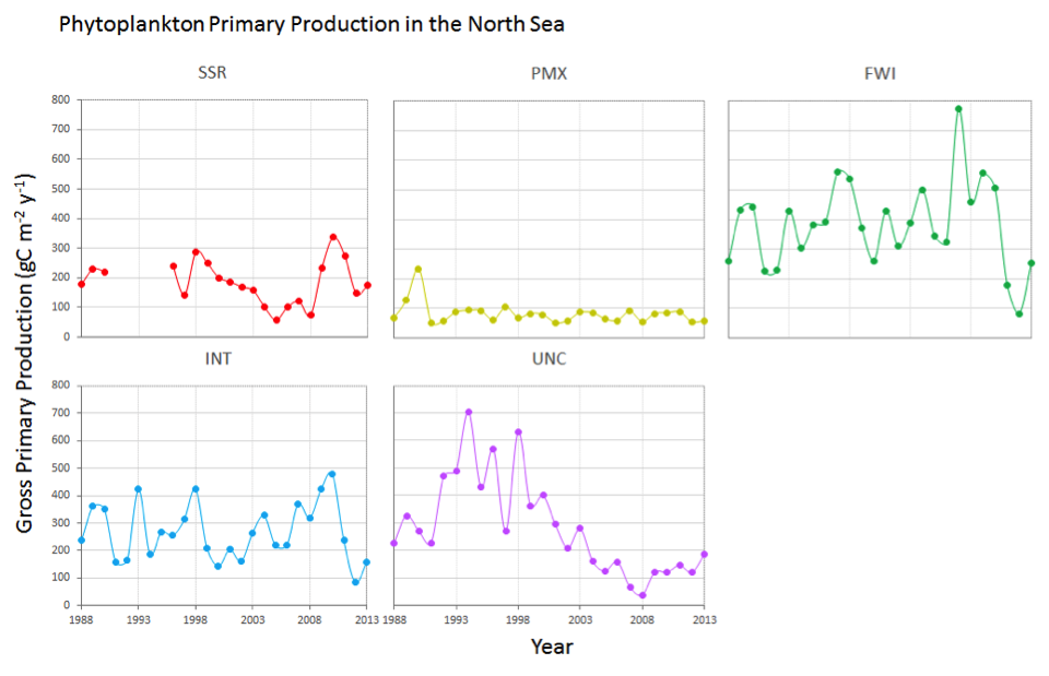 Primary production is partly related to changes in phytoplankton diversity (see assessments of the other plankton indicators: “Changes of plankton functional types”, “Plankton biomass and/or abundance” and “Changes in biodiversity index”) owing to photosynthesis efficiency, photo acclimation capacities, growth rate etc.
