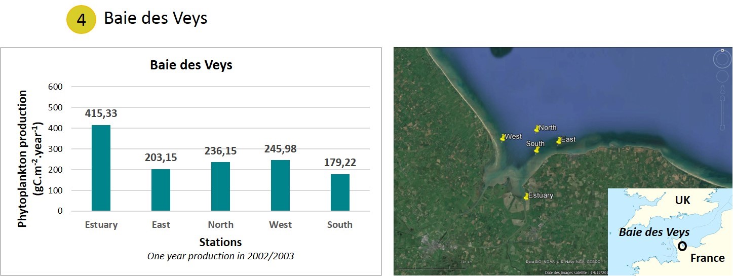 | Baie des Veys | Les estimations annuelles révèlent une production primaire côtière élevée liée aux apports fluviaux en nutriments ce qui étaye à son tour la conchyliculture. | |