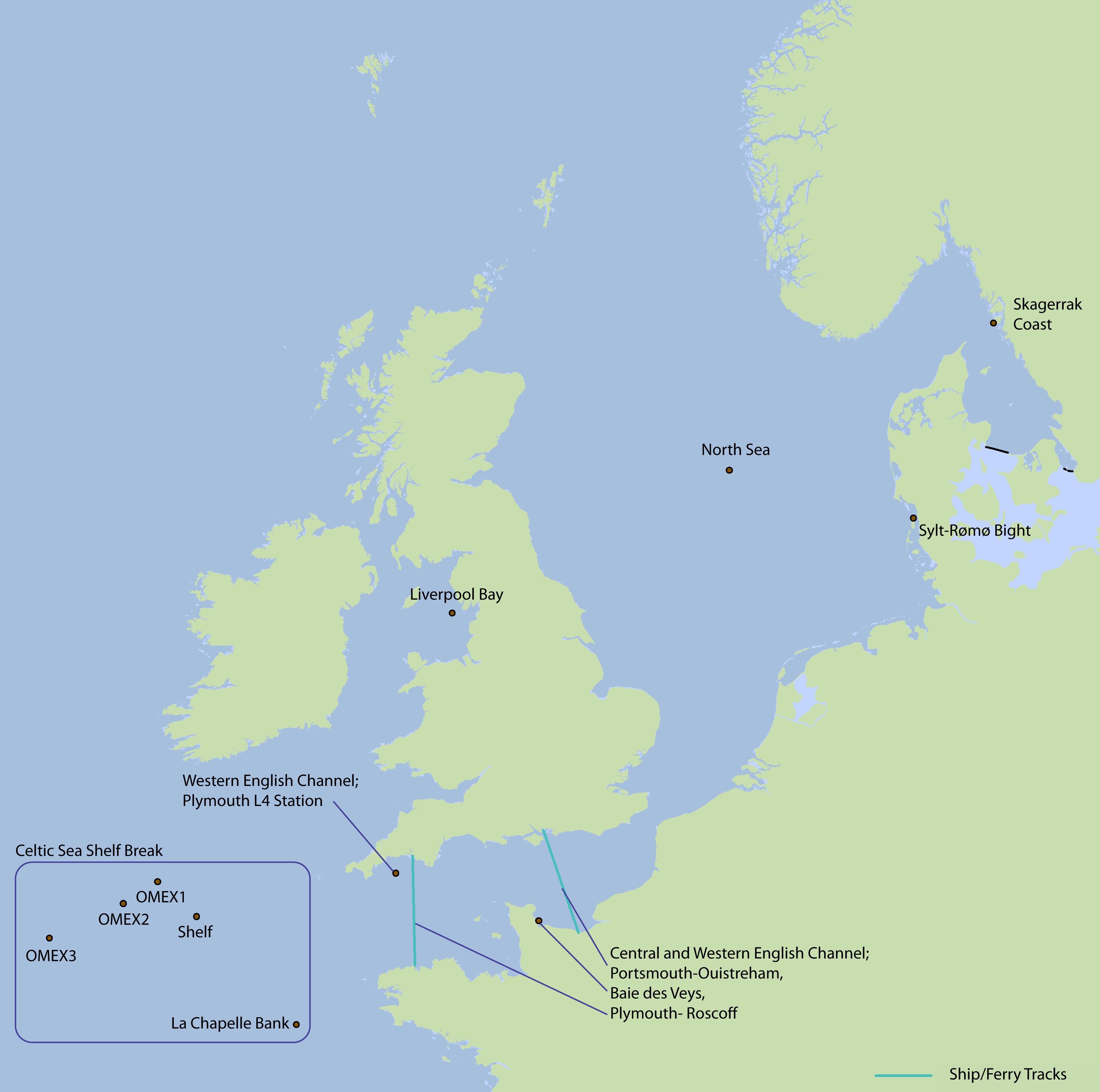 Central and Western English Channel – Ship Track Portsmouth-Ouistreham, Ship Track Roscoff-Plymouth and Baie Des Veys