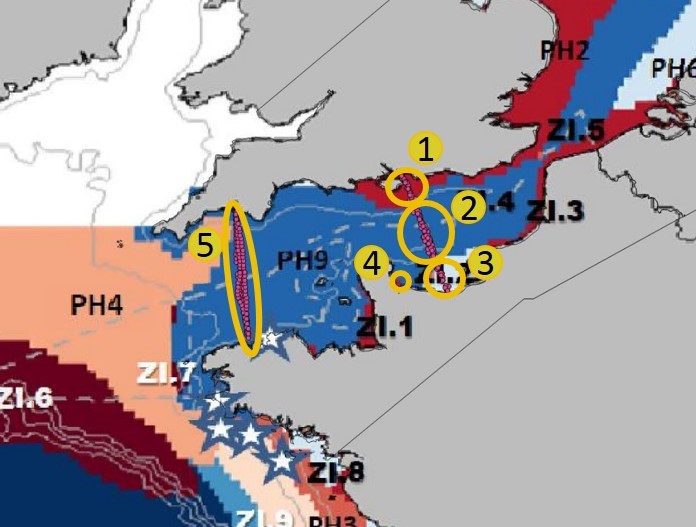 Figure f: Water bodies in the Western and Central English Channel corresponding to five different hydrodynamic zones according to Gailhard-Rocher et al. (2012)