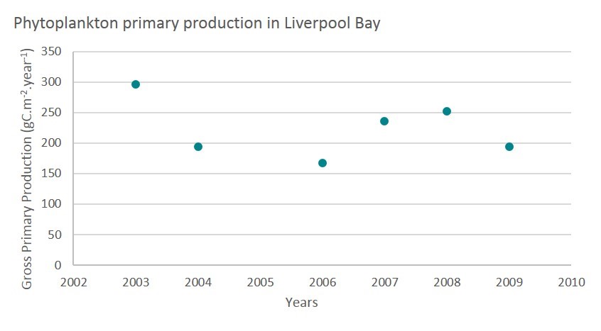 Figure k: Annual primary production calculated from chlorophyll measured at the SmartBuoy in Liverpool bay (united Kingdom) (adapted from Greenwood et al., 2012) (Figure_k_Liverpool.jpg)
