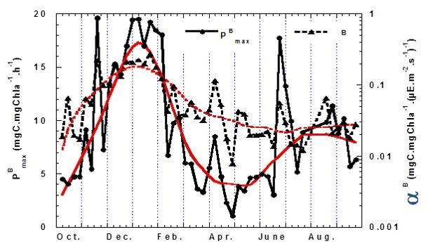 Figure l: Photosynthetic parameters (photosynthetic specific capacity – PB max and photosynthetic efficiency αB) time series in Wimereux, France, littoral waters (2000–2001)