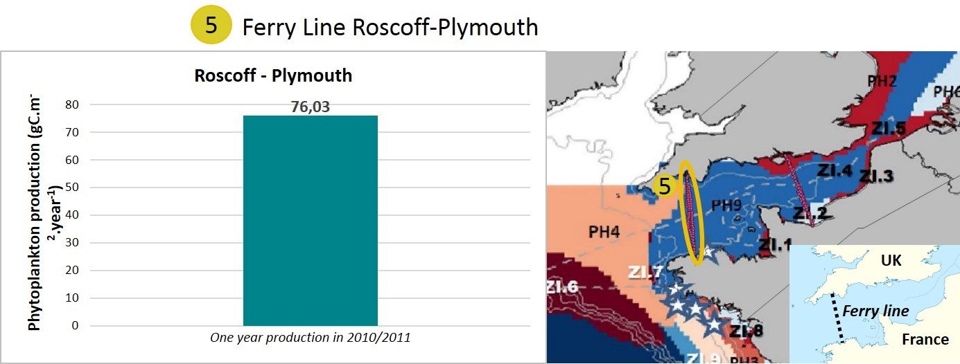 In 2010/2011, data were collected during one year on a ship track between Roscoff (France) and Plymouth (United Kingdom). This ship track covered one hydrodynamic region based on Gailhard-Rocher et al., (2012) (Figure i, water body 5). This water body can be compared to the English Channel offshore area (water body 2) from the Portsmouth-Ouistreham transect. Phytoplankton primary production is also nutrient-limited in this area.