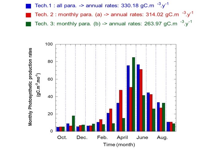 The impact of temporal variability in the two photosynthetic parameters investigated on phytoplankton primary production rates (monthly and annual), were studied considering all dates where photosynthetic parameters were determined (Technique 1). Moreover, two random walk sampling strategies were applied in order to define two series of photosynthetic parameters averaged by month. These were used to calculate two different annual production rates (Techniques 2 and 3) corresponding to two different sampling strategies (at a fortnightly scale).