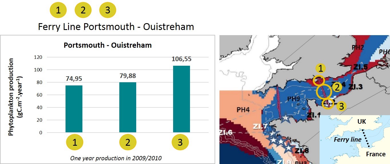 | Manche centrale et occidentale | Transects Portsmouth-Ouistreham | Les estimations annuelles (côtières et au large) révèlent un gradient décroissant pour la production primaire de la côte française au large, qui pourrait être dû aux apports côtiers en nutriments provenant de la Seine. |