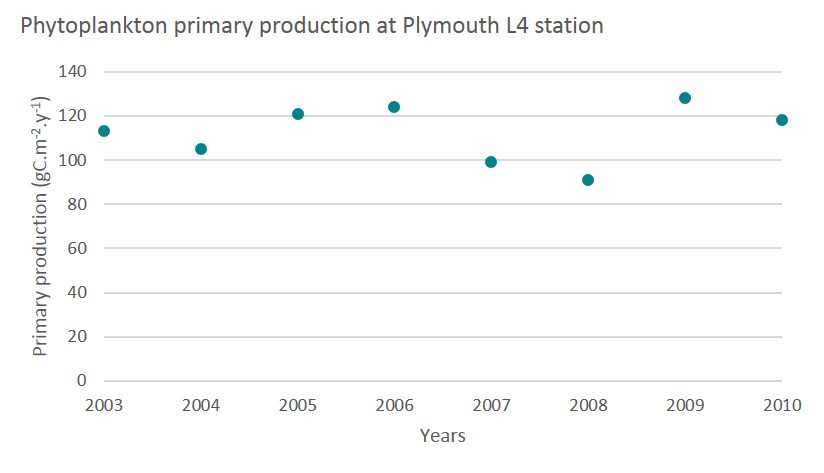 Figure j: Annual phytoplankton primary production at Plymouth L4 station. (adapted from Barnes et al., 2015)