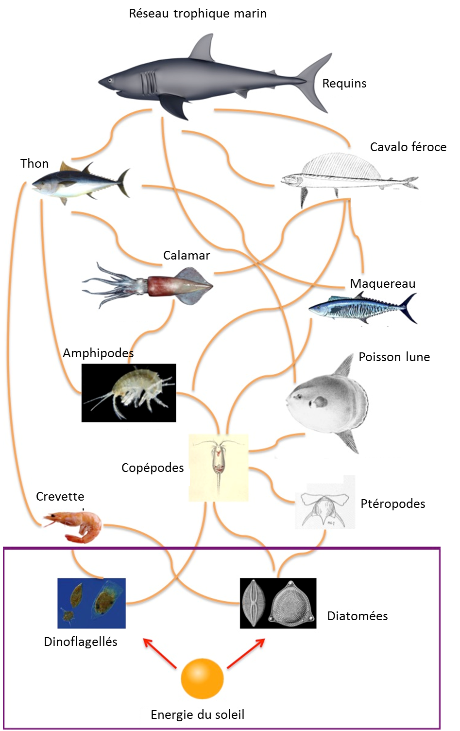 Figure 1: Représentation d’un réseau trophique marin (les encadrés mauves représentent la production primaire de phytoplancton)