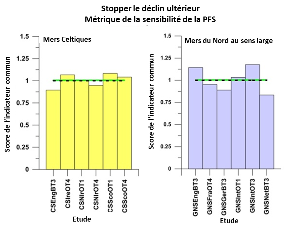 Figure 3: Résultats par rapport à l’évaluation secondaire « stopper le déclin ultérieur des populations » pour les groupes d’espèces sensibles définies par la métrique de la sensibilité de la PFS échantillonnées par les études réalisées dans les mers Celt