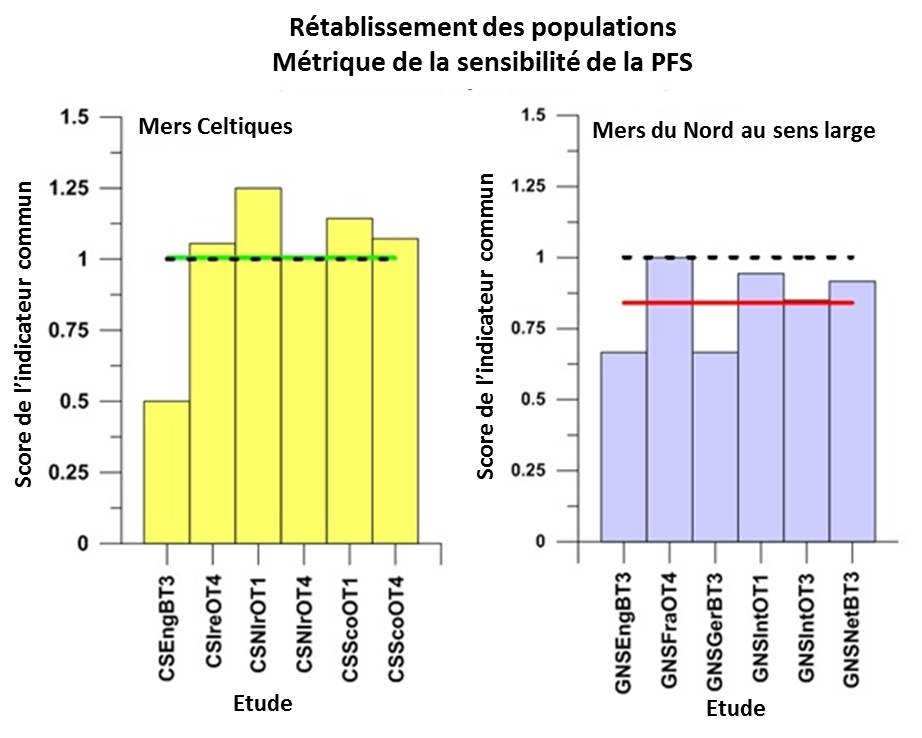 Figure 1: Résultats par rapport à l’évaluation primaire du « rétablissement des populations » pour les groupes d’espèces sensibles définies par la métrique de la sensibilité de la PFS échantillonnées par les études réalisées dans les mers Celtiques et la