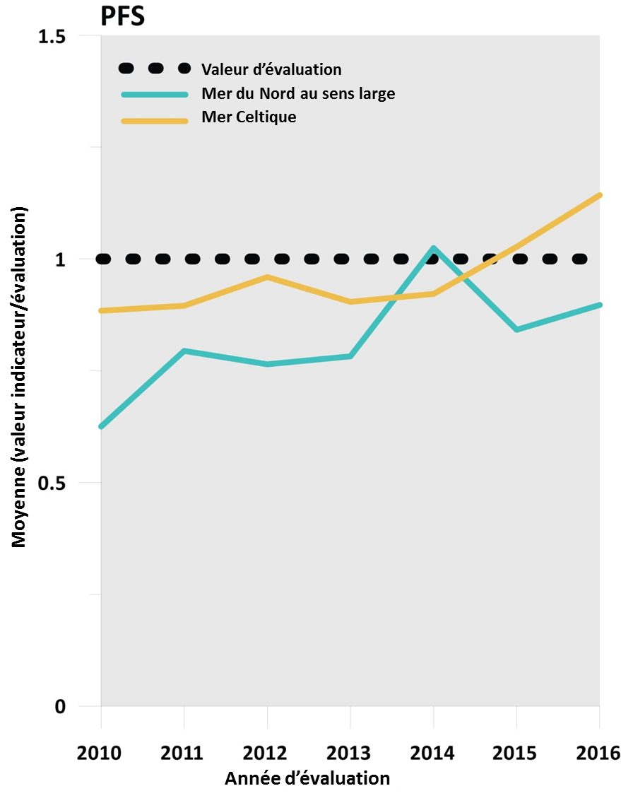 L’abondance des espèces halieutiques sensibles est évaluée par rapport à deux séries différentes de valeurs d’évaluation. La première évaluation étudie si le rétablissement des populations a commencé et l’évaluation secondaire étudie si le déclin a été stoppé. Aux fins de l’Evaluation intermédiaire (IA) de 2017, l’année d’évaluation est la dernière année de chaque série temporelle de l’étude pour laquelle des données sont disponibles. Les deux évaluations utilisent deux métriques de la sensibilité pour définir des groupes d’espèces sensibles (traits d’histoire de vie moyens (ALHT) et proportion d’échec de la reproduction (PFS)). Les deux métriques dépendent des informations sur les traits de vie des espèces. Dans l’ensemble, des résultats cohérents utilisant l’une ou l’autre des métriques démontrent que les résultats de l’évaluation principale étaient solides quelle que soit la métrique choisie. Les résultats de l’évaluation principale devraient cependant se fonder sur la métrique de la PFS développée le plus récemment.