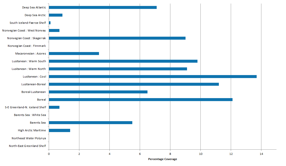 Figure b summarises the proportion of biogeographic areas across the North-East Atlantic that occur within MPAs.