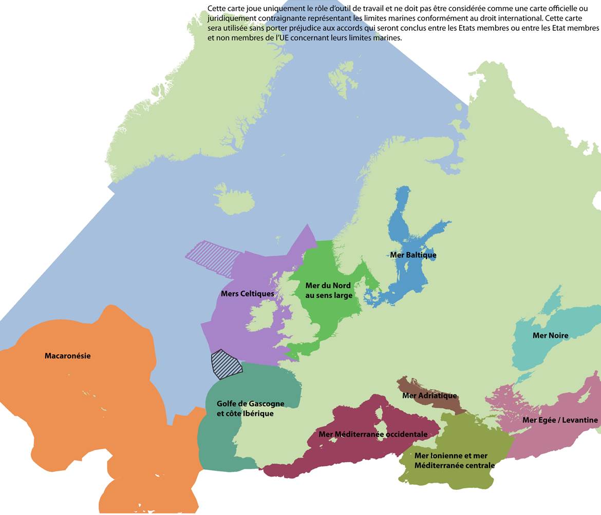 Note 2: La partie hachurée noir et blanc indique la délimitation des limites externes du plateau continental au delà de 200 milles marins des lignes de base des mers territoriales de l’Espagne, de la France, de l’Irlande et du Royaume Uni en ce qui concerne la zone de la mer celtique et du golfe de Gascogne, tels que fournies par les quatre pays à la Commission des limites du plateau continental (CLPC) et incluses dans ses recommandations publiées le 24 mars 2009. La carte de l’étendue du plateau continental sera utilisée sans porter préjudice aux accords qui seront conclus en temps opportun entre ces Etats membres sur leurs limites marines dans cette zone.