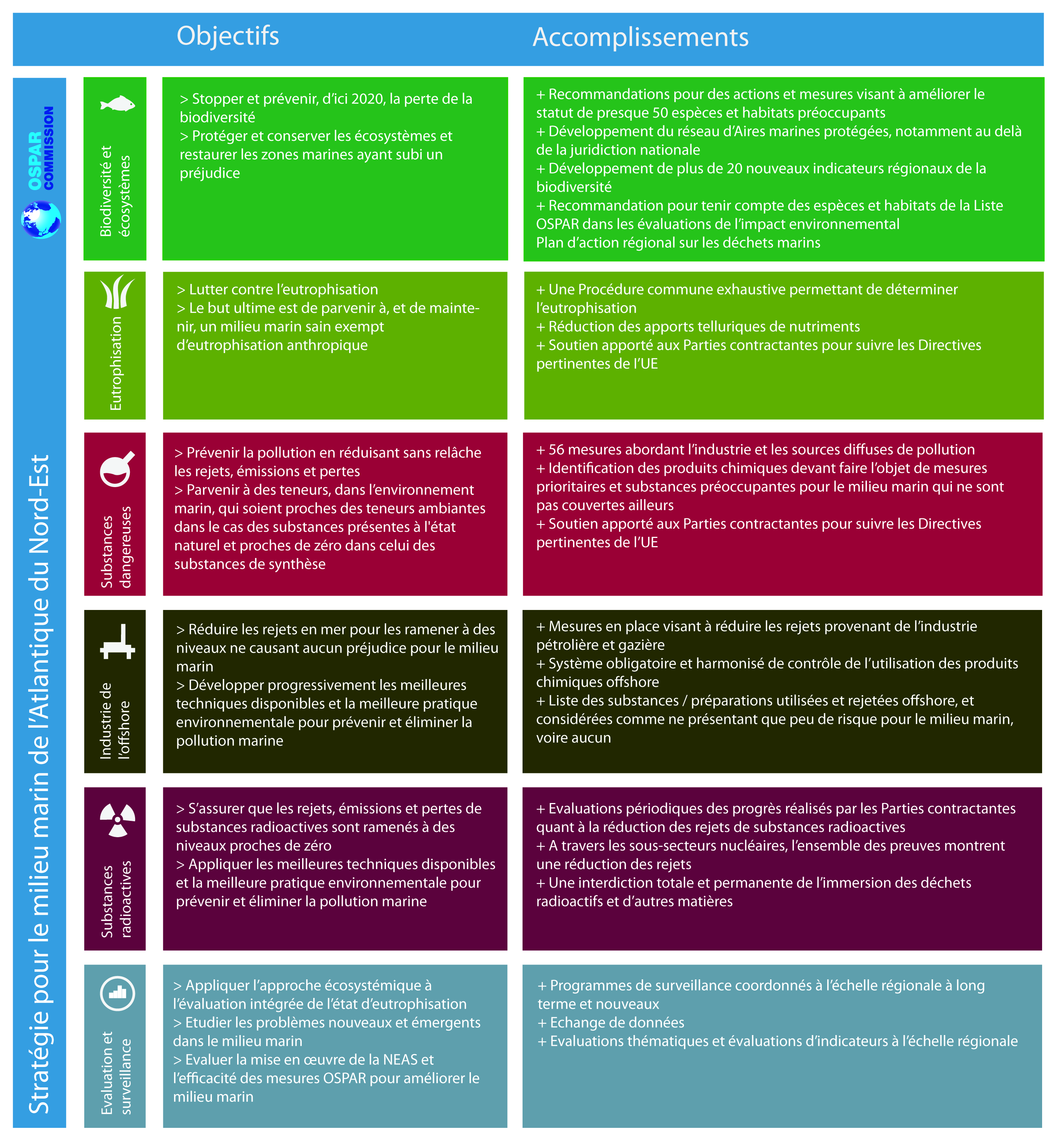 La structure et les travaux d’OSPAR se fondent sur cinq stratégies thématiques et un Programme conjoint d’évaluation et de surveillance (JAMP) interdisciplinaire. Les stratégies et objectifs sont définis dans la Stratégie pour le milieu marin de l’Atlantique du Nord-Est (Stratégie OSPAR). La mise en œuvre des Stratégies thématiques est réalisée dans le cadre des obligations et des engagements des Parties contractantes OSPAR. Depuis sa création, OSPAR passe régulièrement en revue les accomplissements découlant de la mise en œuvre des décisions OSPAR. Certains de ces accomplissements sont soulignés pour chaque Stratégie thématique.