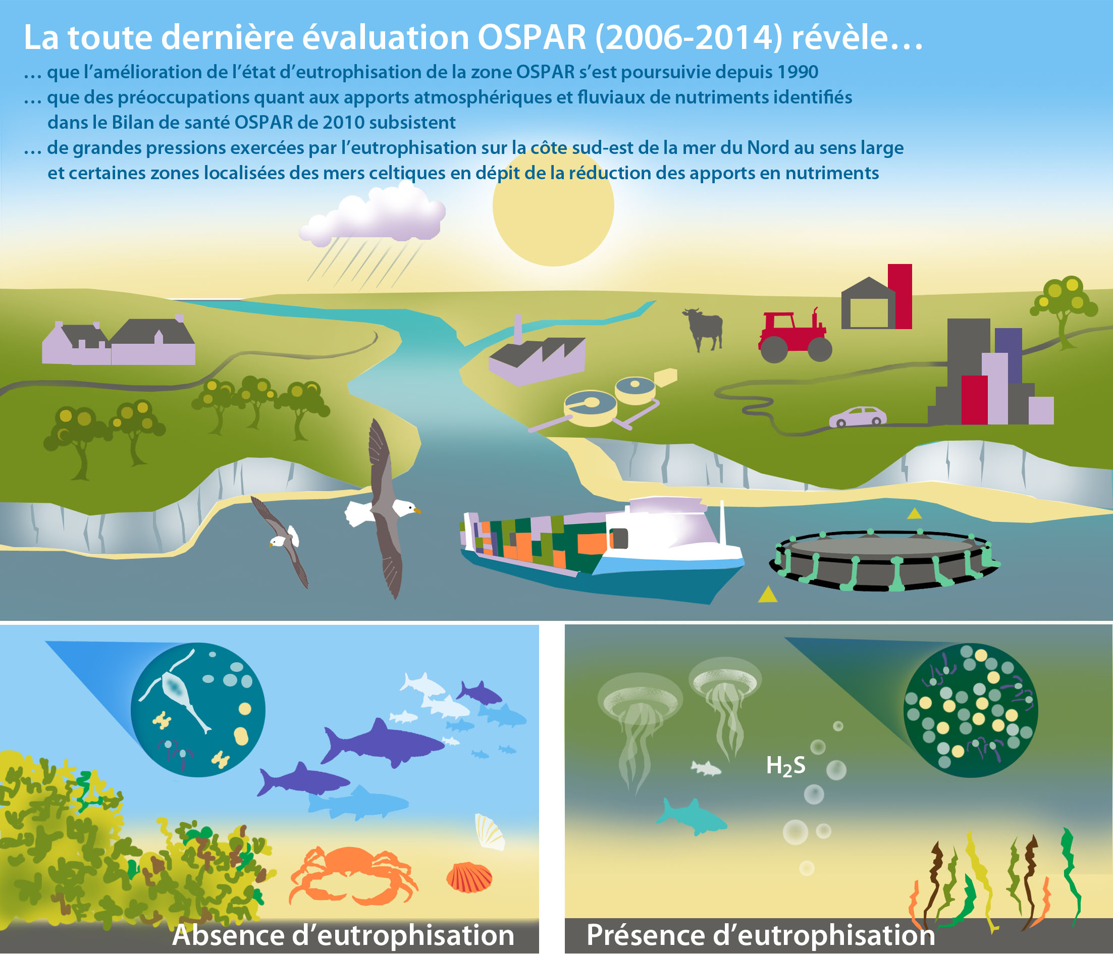 Les résultats de la toute dernière évaluation de l’eutrophisation (couvrant la période de 2006 à 2014) révèlent que l’eutrophisation est encore présente dans la zone maritime OSPAR, en particulier dans les zones sensibles aux apports en nutriments, telles que les estuaires, les fjords et les baies et dans les zones affectées par les panaches fluviaux. L’eutrophisation exerce en particulier des pressions importantes sur la côte sud-est de la mer du Nord au sens large et certaines zones localisées des mers celtiques, ceci en dépit d’apports réduits en nutriments et de teneurs plus faibles en nutriments relevées dans le milieu marin.