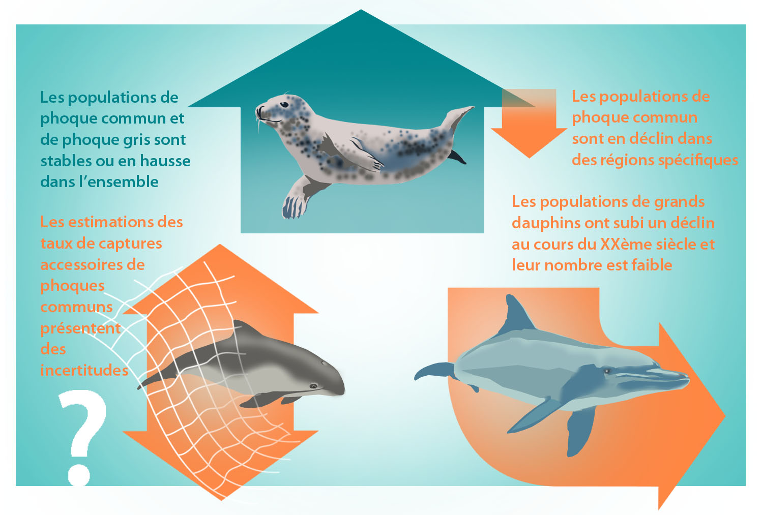Comme l’indiquait déjà le Bilan de santé OSPAR (QSR 2010), dans l’ensemble les populations de phoque commun et de phoque gris sont stables ou en hausse dans la plupart des zones évaluées bien que certaines populations de phoque commun soient en déclin dans des régions spécifiques. Inversement, les populations côtières de grands dauphins ont subi un déclin au cours des XIX et XXème siècles et leur nombre est faible mais stable dans certaines zones au début du XXIème siècle.