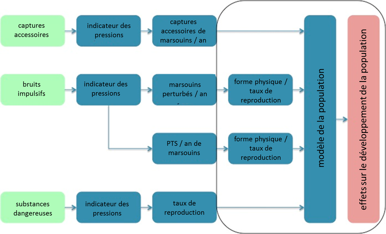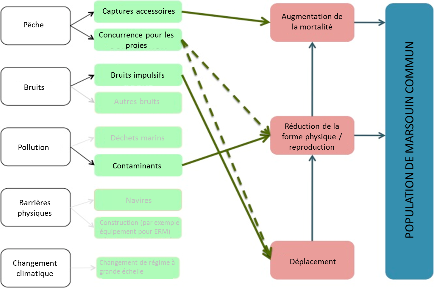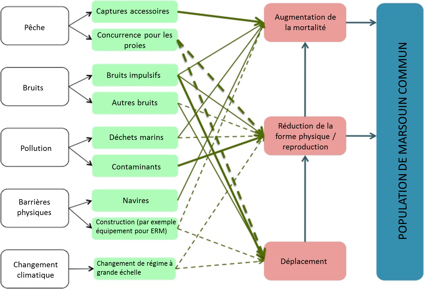 Il s’agit d'un aperçu schématique des mécanismes d’effet potentiel par lesquels les activités humaines peuvent affecter les populations de marsouin commun, l’objectif de cette étude de cas a que ce soit spécifique pour les (une série limitée de) pressions considérées les plus pertinentes. Les lignes épaisses du graphique indiquent un rapport établi qui est également et probablement d’une importance relative. Les rapports indiqués par des lignes fines sont également établis mais on considère que leur importance relative est bien moindre. Les lignes pointillées indiquent des rapports que l’on présume exister mais qui n’ont pas été établis ou ne peuvent pas encore être quantifiés. L’épaisseur des lignes pointillées indique également l’importance relative de ces rapports.