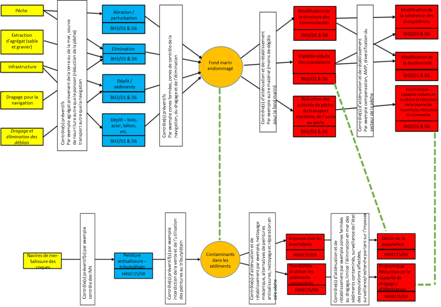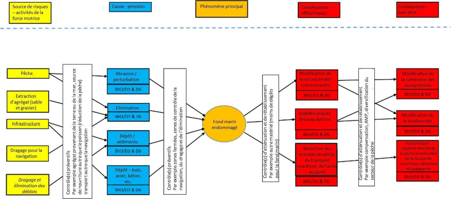 L’évaluation des effets cumulatifs dans le prochain QSR OSPAR se concentrera sur des composants prédéfinis (nœud papillon) basés sur les programmes de travail essentiels des comités thématiques OSPAR. Les nœuds papillon sont créés pour résumer et élargir le contenu des fiches d’évaluation pour chaque indicateur commun OSPAR. Un exemple de nœud papillon pour l’indicateur de la dégradation du fond marin (BH3) se trouve dans la Figure 4.