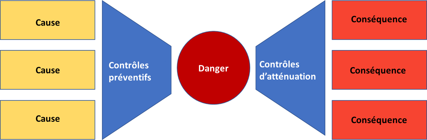 - la première série de contrôles se situe entre les causes et l’évènement central (le nœud). Ces barrières ont pour but d’empêcher les causes de présenter un danger en les éliminant, évitant et contrôlant (par exemple réduire la probabilité d’un danger tel qu’une modification de l’état des écosystèmes). On appelle souvent ces « barrières » des contrôles préventifs.